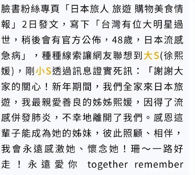 后来大S的去世消息传出,通过小S的证实大家才得知,她是因为在日本患上了流感并发肺炎才永远的离开了这个世界。 但当时他们全家人一同到日本旅行,患病的却只有大S一个,这与她一直以来比较弱的身体状况也有着密不可分的关系。